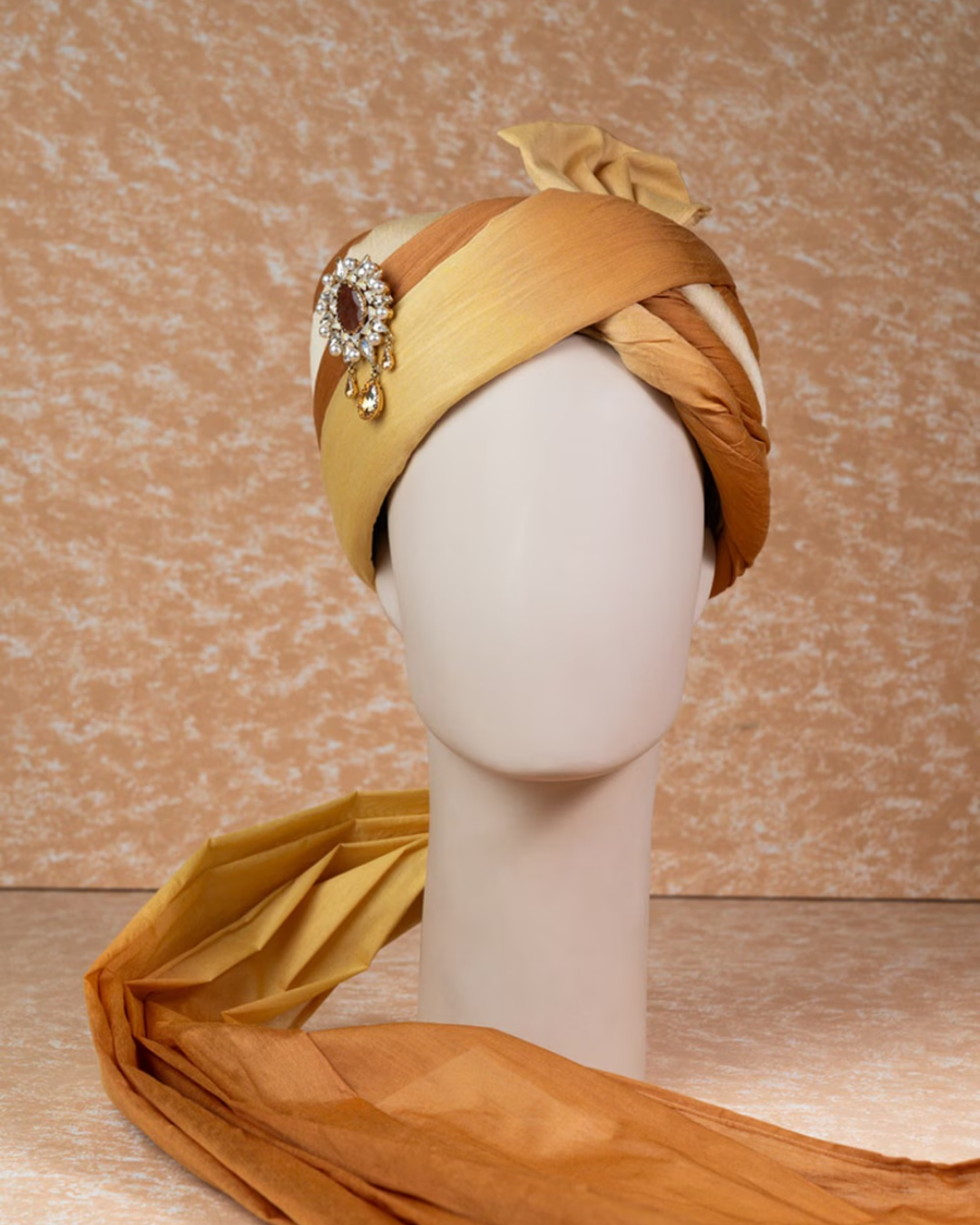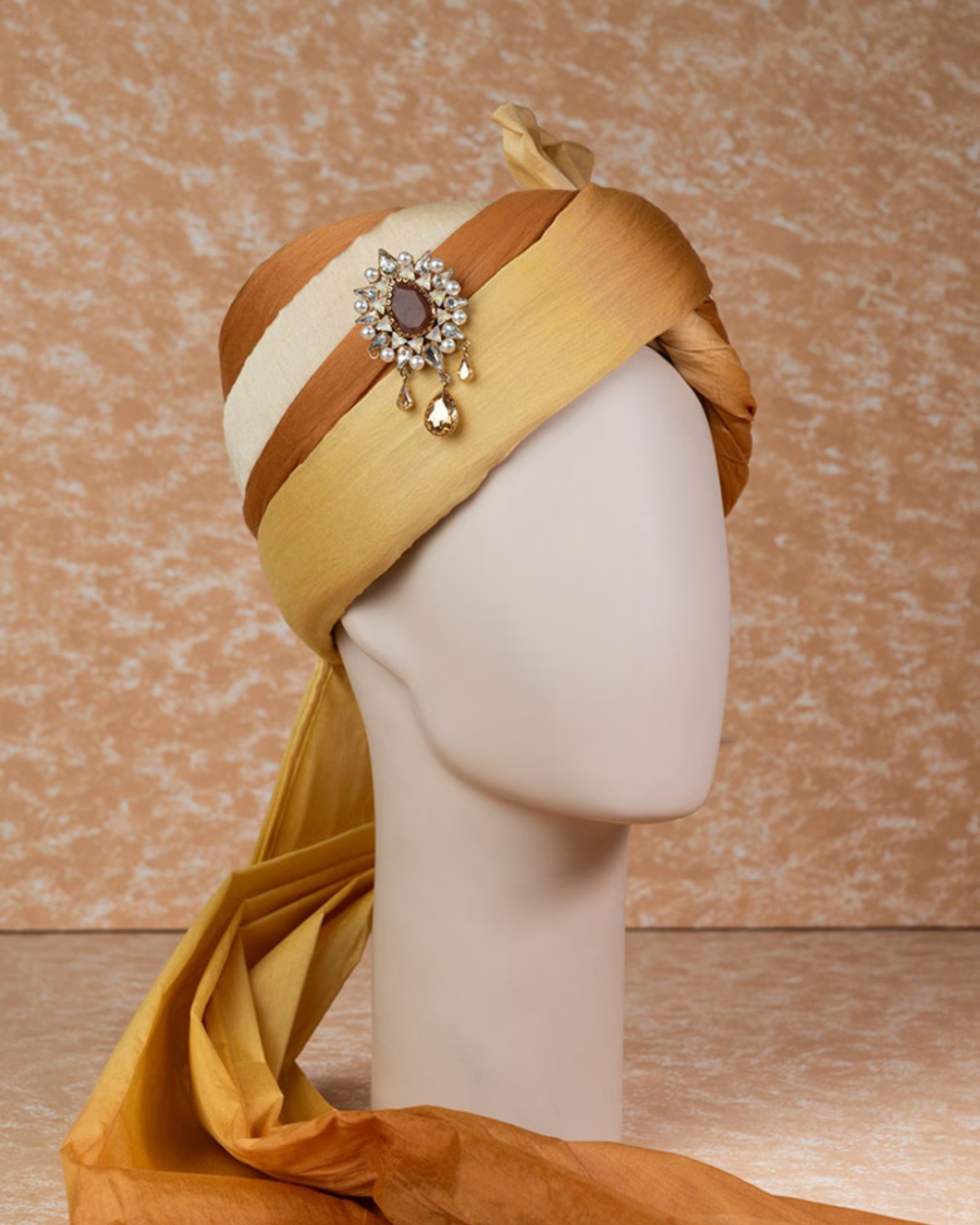 Amber Gold Ombre Feta Groom Safa Pagdi Turban with Brooch | Traditional Indian Wedding Accessory