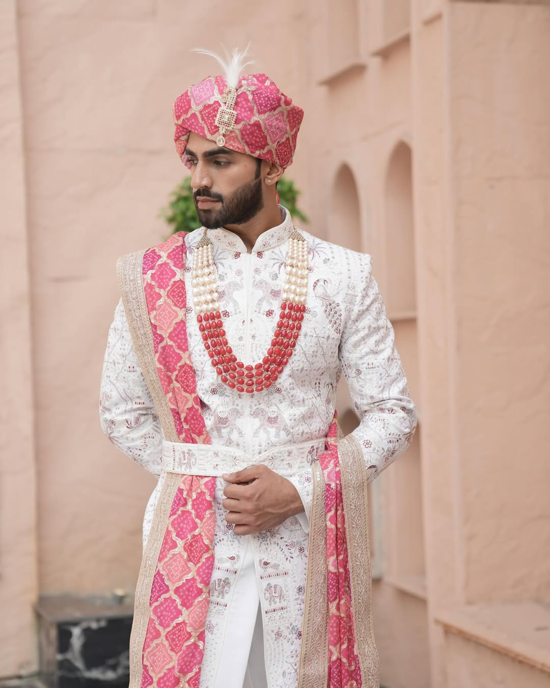 Blush Pink Feta Groom Safa Pagdi Turban with Printed Stole & Pearl Mala | Traditional Indian Wedding Accessory