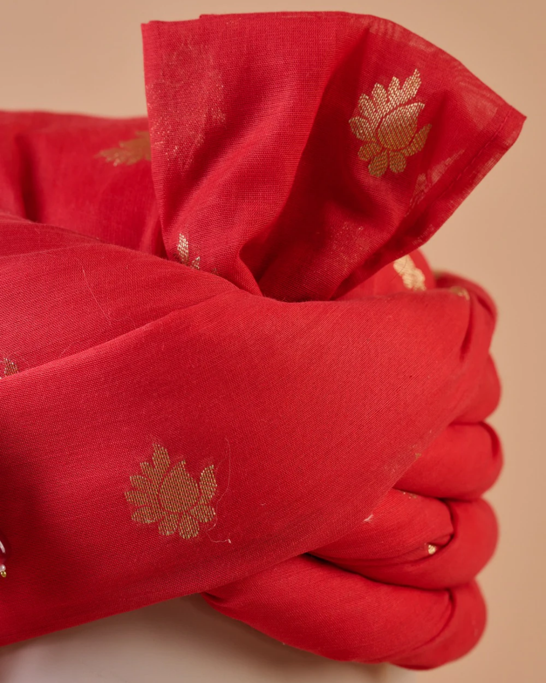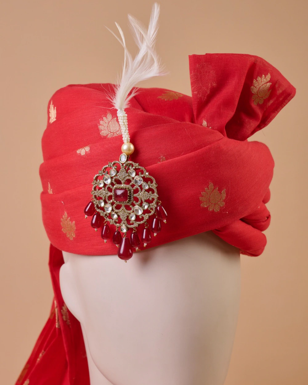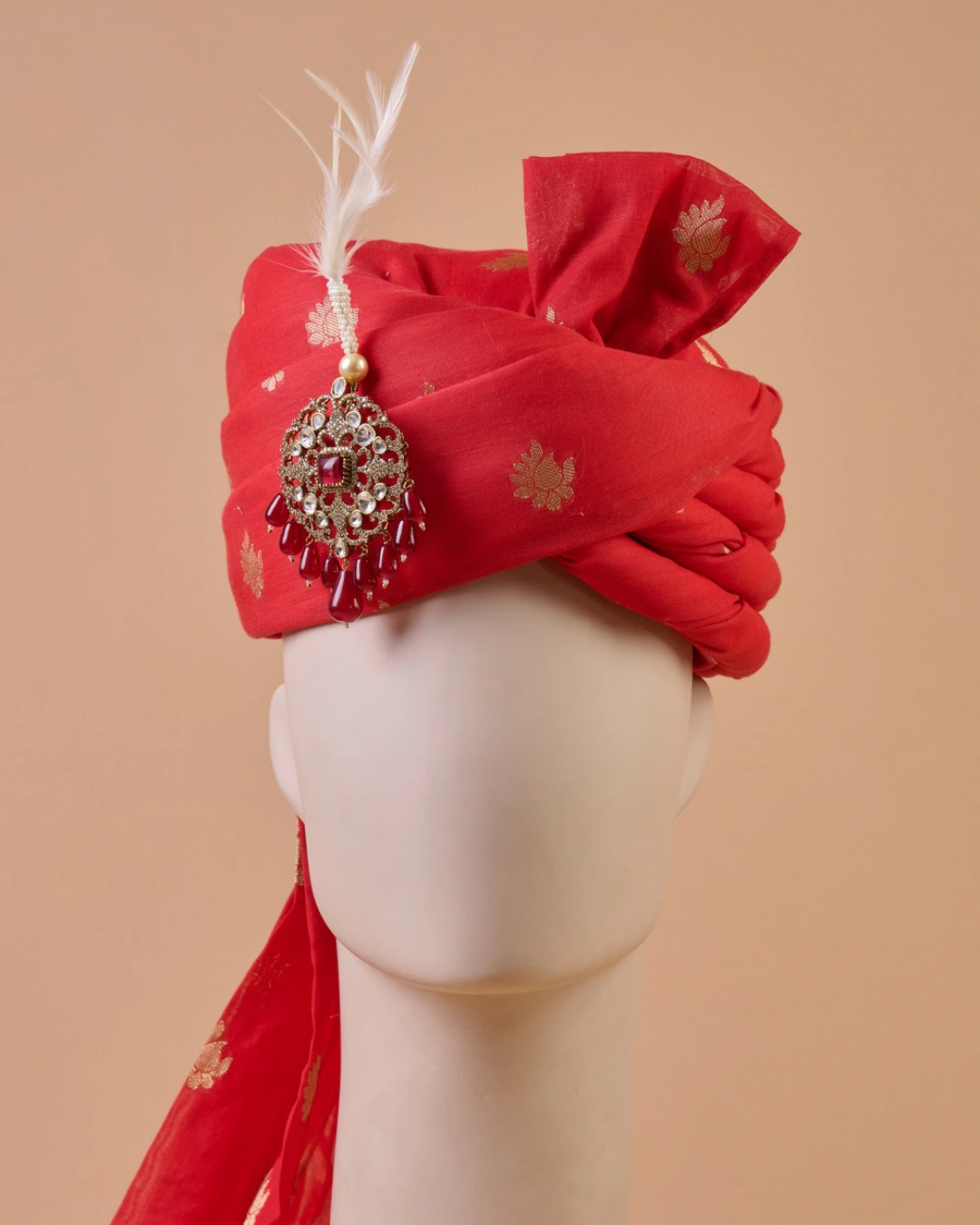 Crimson Zari Feta Groom Safa Pagdi Turban with Brooch & Feather | Traditional Indian Wedding Accessory