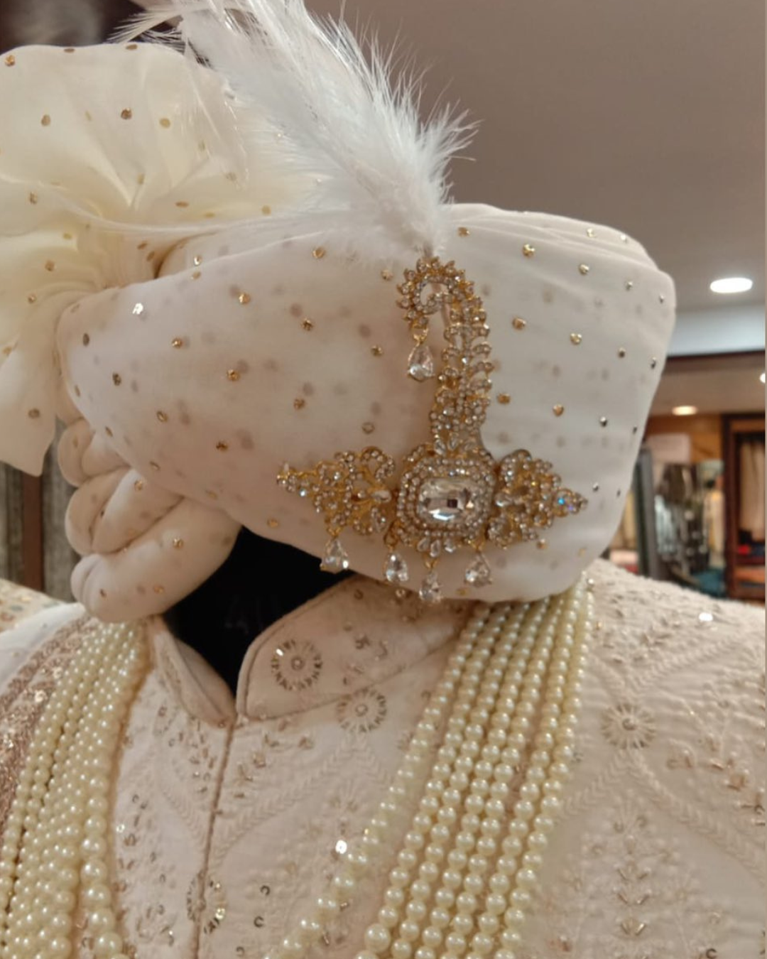 Ivory Crystal Studded Feta Groom Safa Pagdi Turban with Feather & Ornate Brooch | Traditional Indian Wedding Accessory