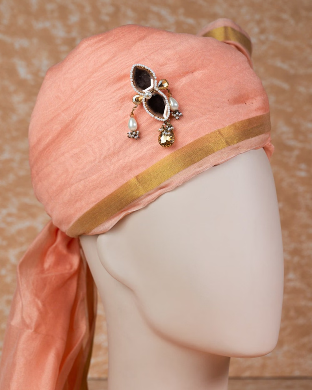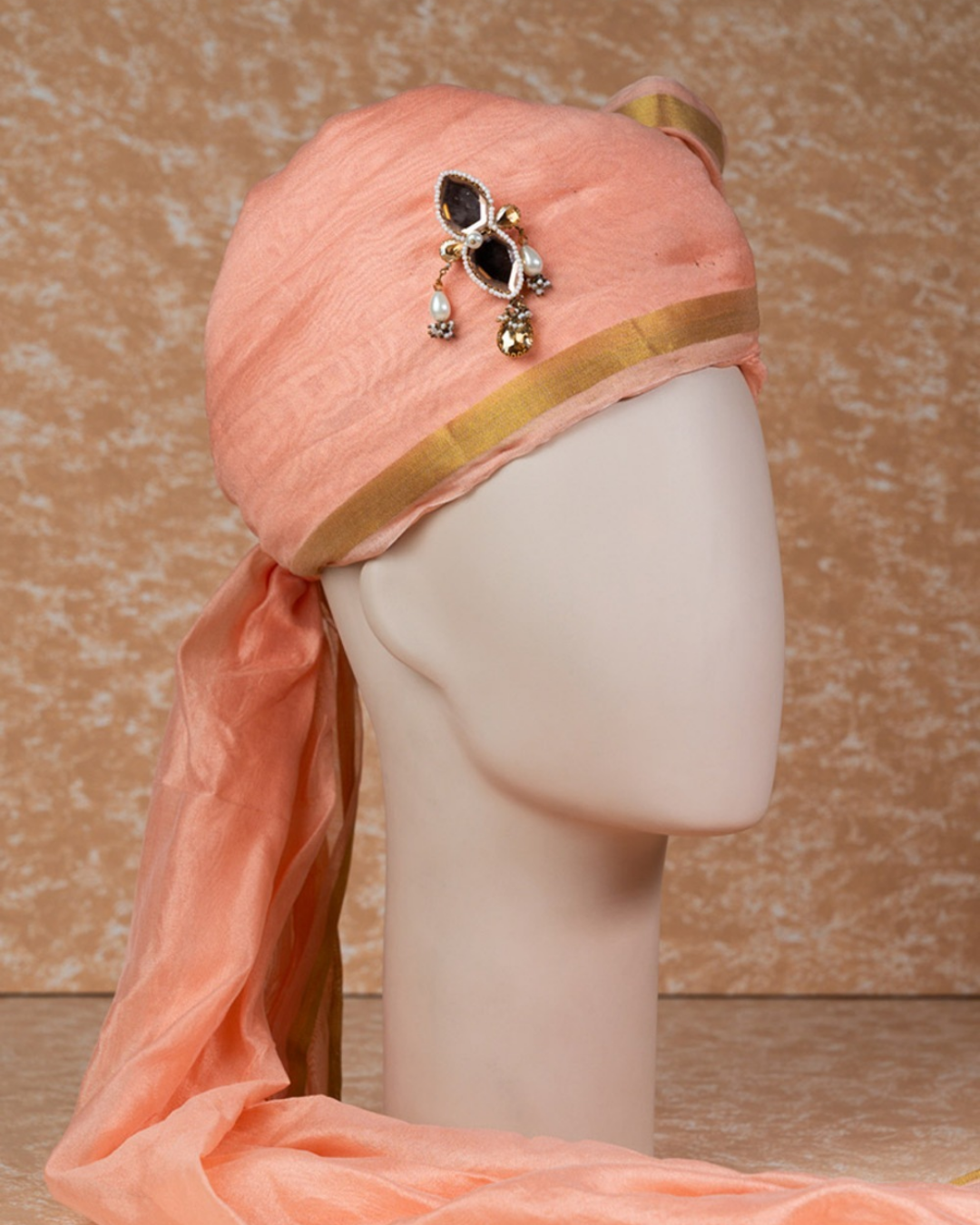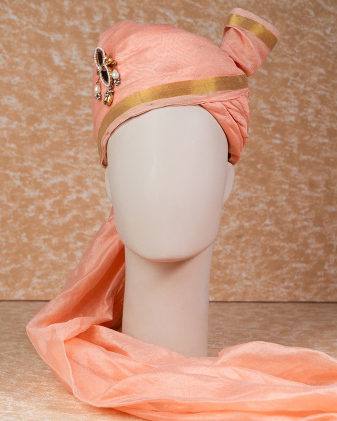 Peach Gold Feta Groom Safa Pagdi Turban with Brooch | Traditional Indian Wedding Accessory