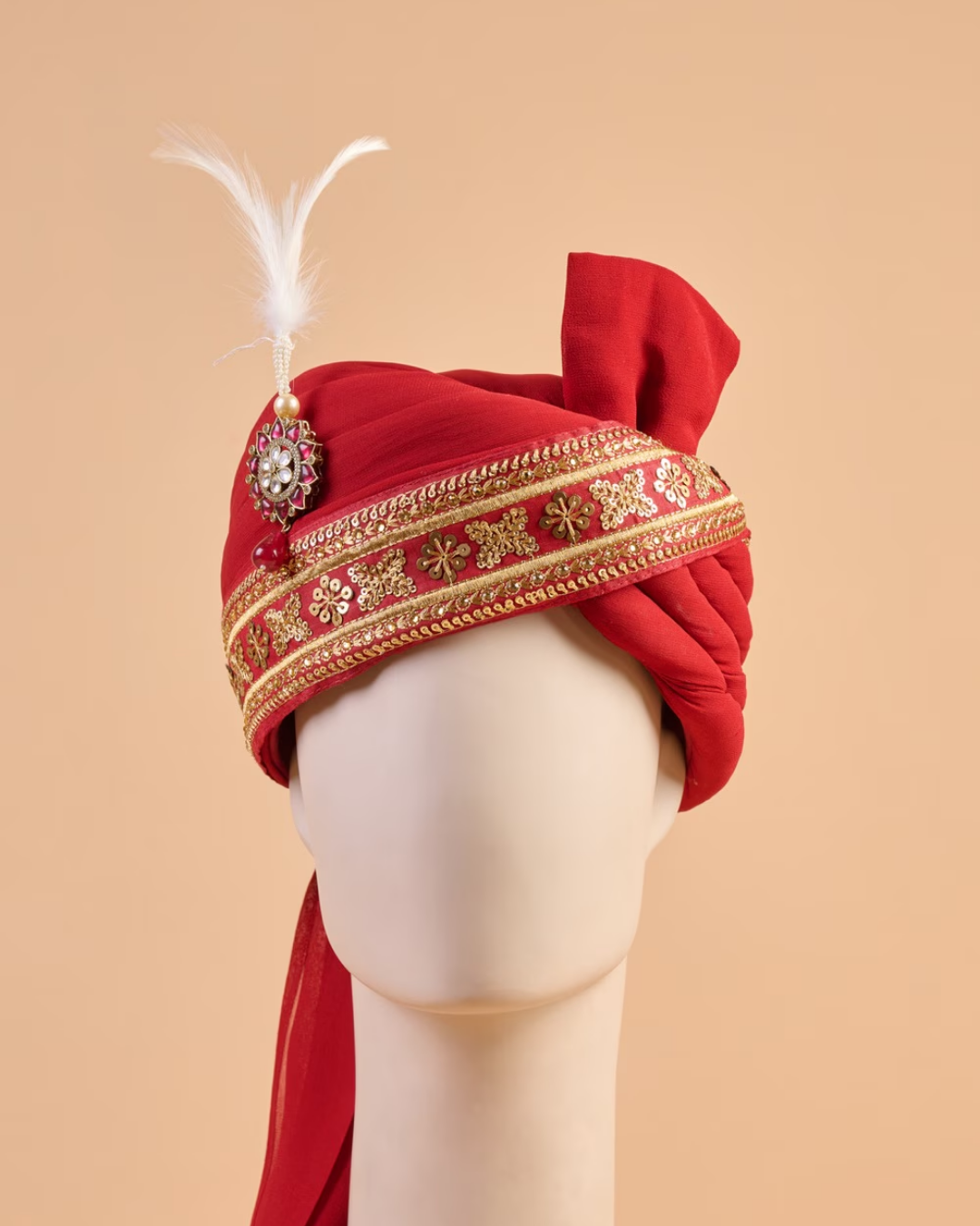 Royal Red Maharaja Feta Wedding Barati Safa Pagdi Turban with Brooch and Feather | Indian Wedding Groom Accessory quantity