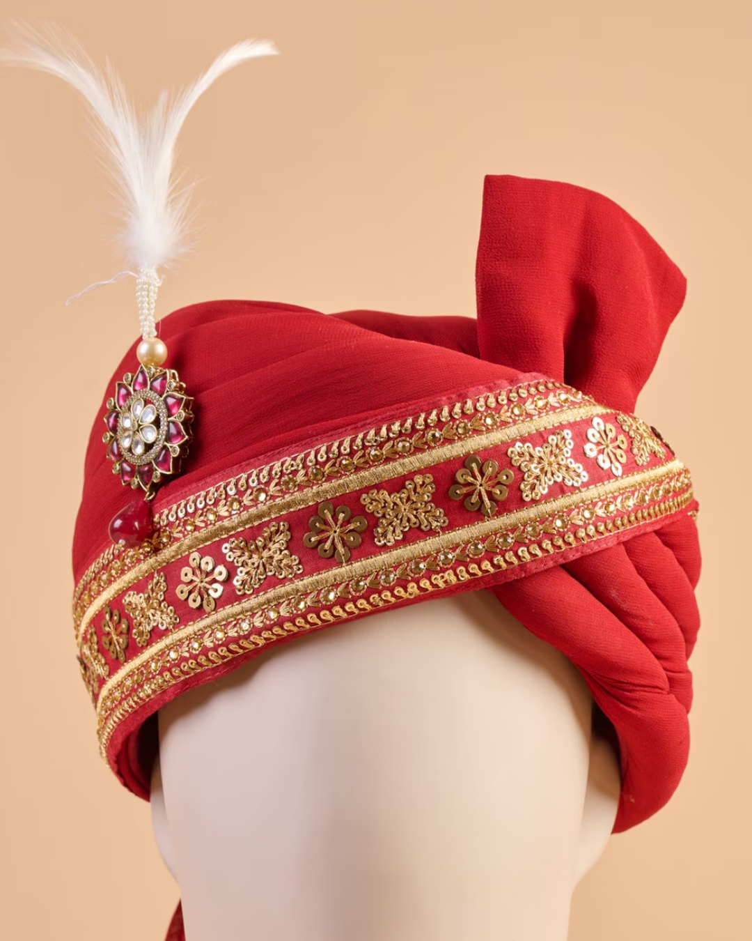 Crimson Zari Feta Groom Safa Pagdi Turban with Brooch & Feather | Traditional Indian Wedding Accessory